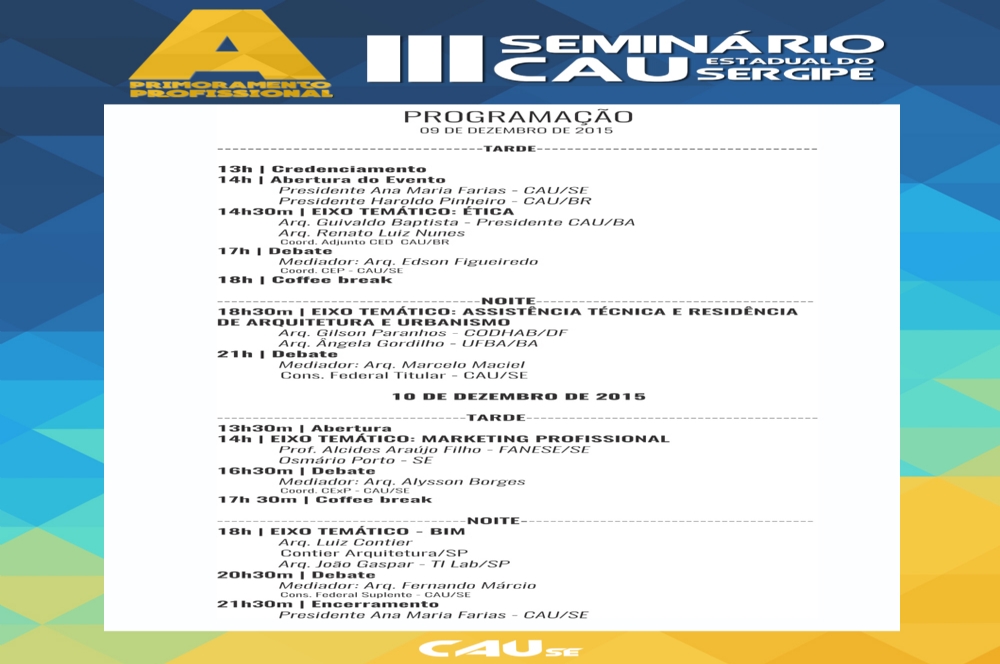 Profissionais de renome estarão presentes no III Seminário Estadual de Arquitetura e Urbanismo de Sergipe como os arquitetos João Gaspar (SP), Angela Gordilho (BA), Luiz Contier (SP), Gilson Paranhos (DF), Renato Luiz Nunes (BSB) e o especialista em marketing, Osmário Porto (SE), além dos presidentes do CAU/BR, Haroldo Pinheiro, do CAU/BA, Guivaldo Baptista e do CAU/SE, Ana Maria Farias.