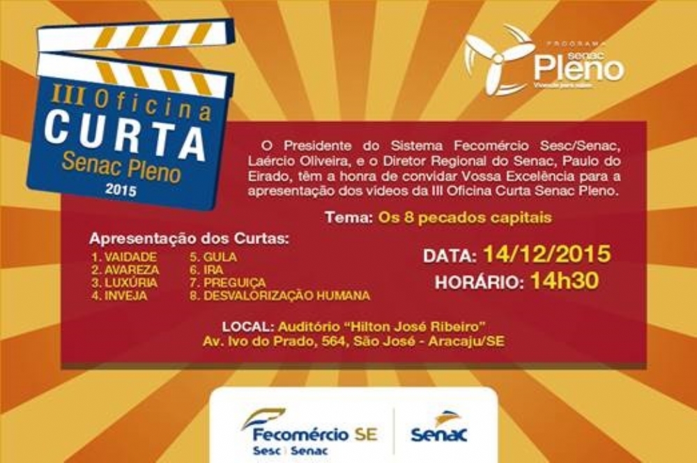 Os oito curtas-metragens (Gula, Avareza, Luxúria, Ira, Inveja, Preguiça, Vaidade e Desvalorização Humana) serão apresentados ao público que assistirá ao uma sessão de cinema com direito à pipoca, nessa segunda-feira (14/12), às 14h30, no auditório do Senac. Alunos da instituição, familiares e a imprensa local estão convidados para prestigiar os curtas que foram desenvolvidos ao longo do ano, envolvendo cerca de 70 alunos que se dividiram em diversas etapas, como: roteiro, direção, produção, arte, som e montagem.