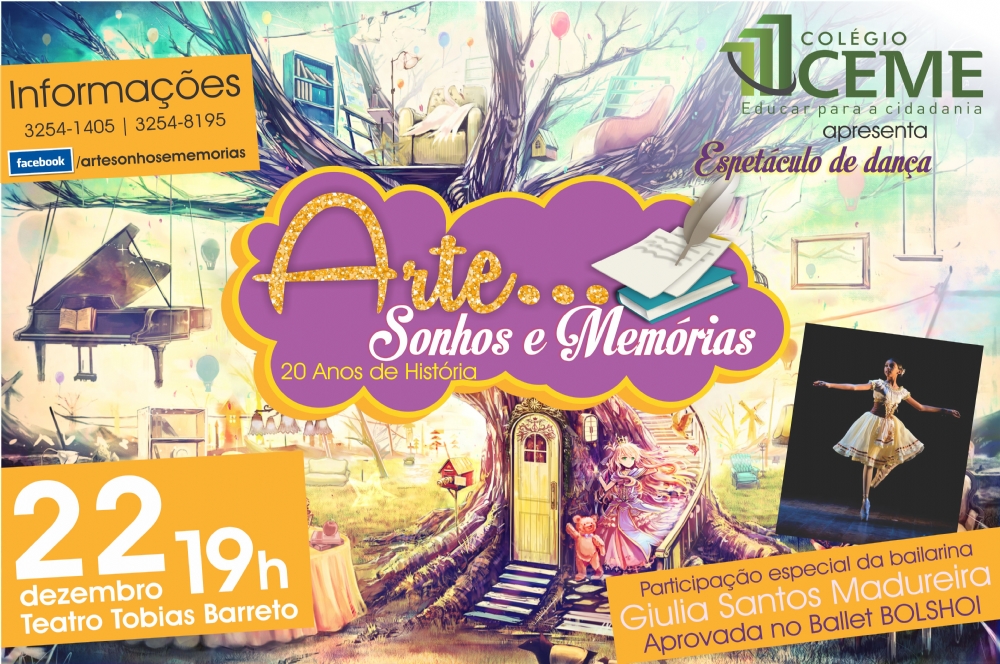 A bailarina Giulia Santos, aprovada na Escola de Ballet do Teatro Bolshoi no Brasil, e os alunos do Colégio Ceme apresentarão o espetáculo “Arte…Sonhos e Memórias – 20 anos de história”. O evento é uma realização do Colégio Ceme, que através de fantasias e dança, pretende proporcionar ao público uma viagem no tempo para relembrar os momentos mais marcantes da trajetória da instituição.