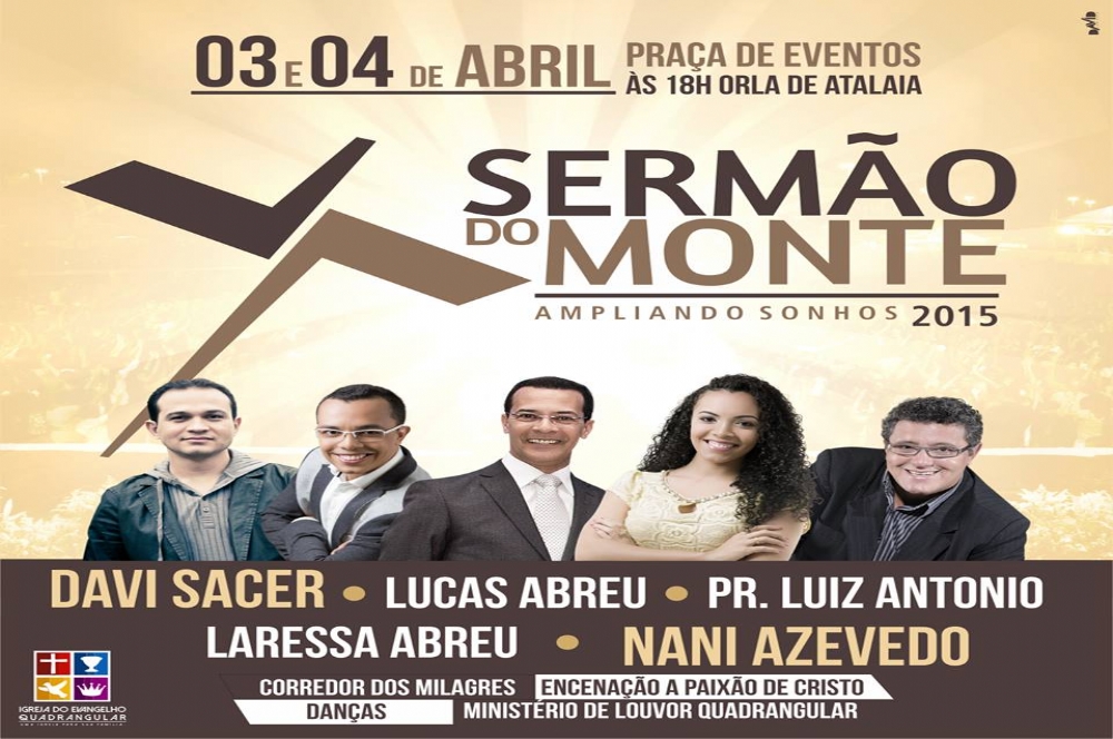 Nos próximos dias 03 e 04 de abril, a Igreja do Evangelho Quadrangular de Sergipe (IEQ-SE) realizará o evento “Sermão do Monte”, que faz parte do calendário oficial do Estado. Em 2015, já em sua 18ª edição, o evento terá como tema “Ampliando os Sonhos” e deverá reunir, novamente, milhares de pessoas na Praça de Eventos da Orla de Atalaia.