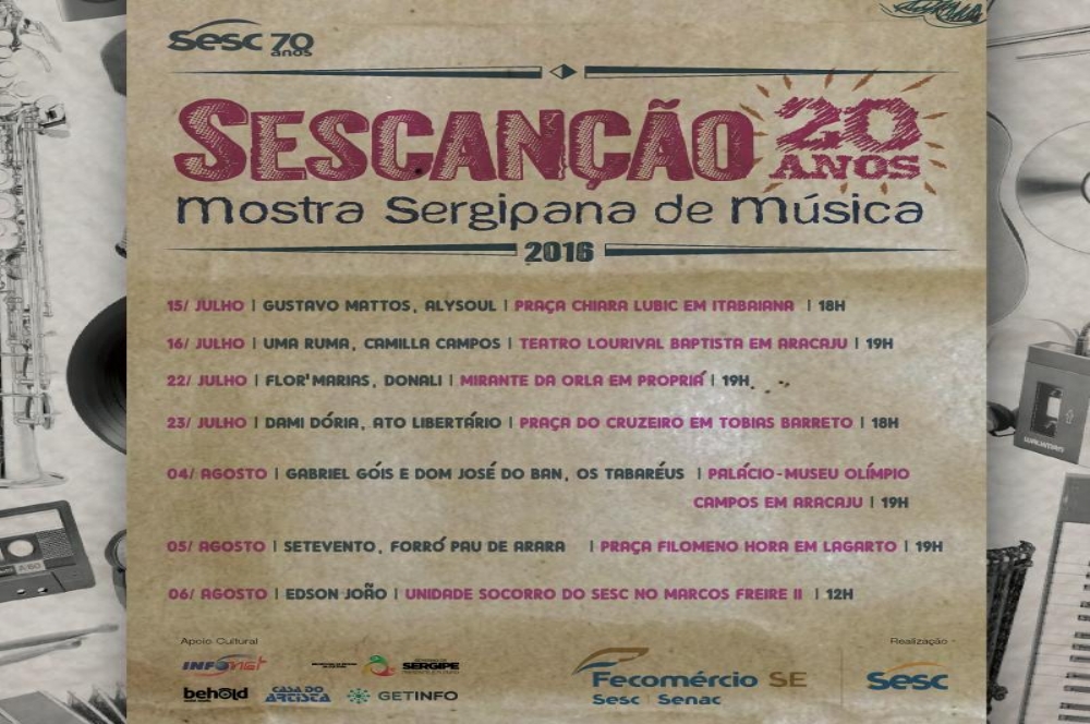 O Sesc abriu as inscrições para o Sescanção – Mostra Sergipana de Música que este ano comemora 20 anos de realização. Nesta edição comemorativa a instituição irá realizar o Circuito Sescanção com apresentações musicais dos artistas selecionados na última edição da mostra. As apresentações irão ocorre na capital e nos municípios de Itabaiana, Propriá, Tobias Barreto e Lagarto, entrada franca. As inscrições são gratuitas e podem ser feitas através do endereço www.sesc-se.com.br/sescancao.