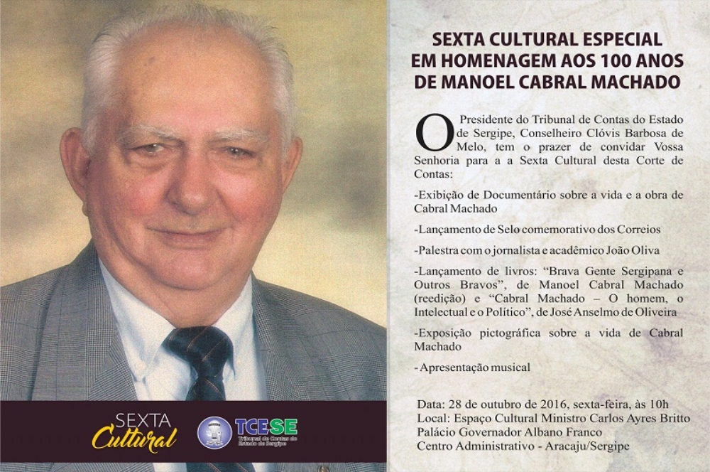 A comemoração do centenário de Manoel Cabral Machado, assim como do também conselheiro José Amado Nascimento, ocorrida em agosto, são iniciativas do próprio presidente do TCE, Clóvis Barbosa de Melo, que também envolveu a Assembleia Legislativa e a Academia Sergipana de Letras. Na segunda-feira, 24, houve uma sessão especial na Alese e, no próximo dia 7 de novembro, a ASL realizará uma sessão solene em homenagem àquele que também presidiu a casa dos imortais sergipanos.