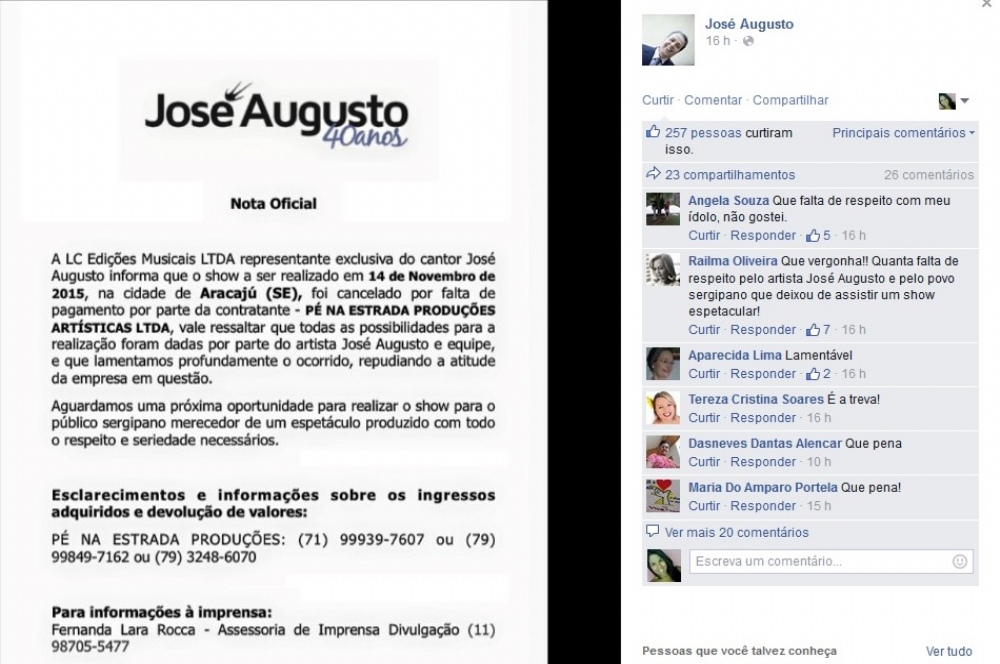 O show do cantor do José Augusto, que seria realizado neste sábado, 14, no Gonzagão, em Aracaju, foi cancelado. A empresa LC Edições Musicais, que representa o artista, publicou na página dele uma nota oficial na qual informava que o evento foi cancelado devido à falta de pagamento por parte da empresa contratante, a Pé na Estrada Produções.