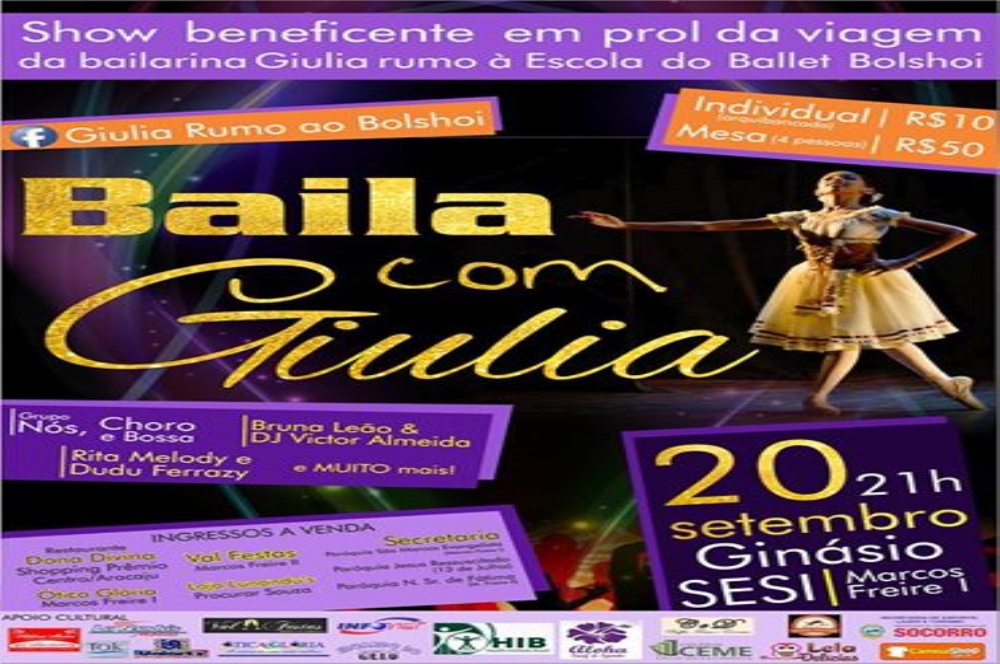 Familiares de Giulia Santos Madureira, de 12 anos, que foi indicada para a seleção da Escola de Teatro Bolshoi no Brasil, realizarão no dia 20 de setembro, um evento no intuito de arrecadar fundos para custear as despesas da jovem durante a terceira e última etapa da seletiva do Bolshoi no Brasil que vai acontecer de 16 a 18 de outubro no Joinville em Santa Catarina.