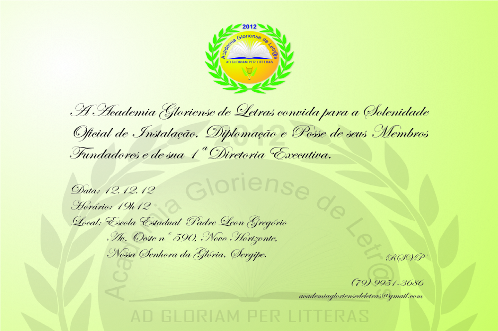 Solenidade de instalação da AGL acontece no dia 12 desse mês. O município de Nossa Senhora da Glória deu um passo importante no sentido de incentivar a leitura e a produção literária no Alto-Sertão Sergipano com a fundação da Academia Gloriense de Letras (AGL), que estará em pleno funcionamento a partir de 2013.