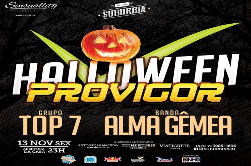 O dias das bruxas no Suburbia será comemorado em plena sexta-feira 13 com o Halloween Provigor. O Grupo Top 7 e a banda Alma Gêmea são as atrações da festa, que começa a partir das 23 horas, no próximo dia 13 de novembro.