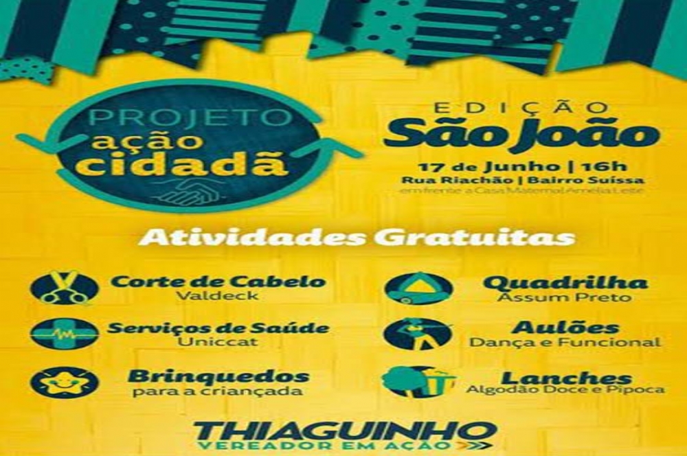 Exames de saúde, corte de cabelo, atividades esportivas e muito forró. Estes são alguns dos atrativos do projeto Ação Cidadã edição São João, que ocorrerá no próximo sábado, 17, a partir das 17h, na Rua Riachão. O organizador do evento, vereador Thiaguinho (PMB), garante que já está tudo pronto. "Nós preparamos uma grande festa para os moradores do bairro. Além de muita música, a população contará com serviços gratuitos e um espaço reservado para as crianças", disse.