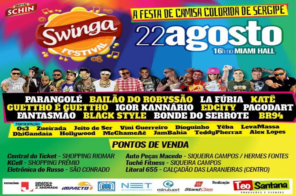 O Swinga Festival acontece no próximo dia 22, a partir das 16 horas, no Miami Hall. A famosa festas das camisas coloridas invade o Estado na sua quinta edição e 12 horas de shows sem intervalo. Sobem ao palco, o Parangolé, Bailão do Robysão, La Fúria, Katê, Guettho É Ghettho, Igor Kannário, Edcity, Pagodart, Fantasmão, Black Style, Bonde do Serrote e BR94.