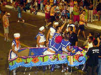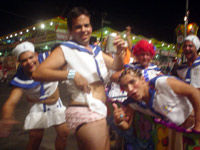 moradas. “Elas nos montam e depois vêem nos prestigiar durante o desfile”. Não falta nada na produção. Além da farda de marinheira, os rapazes fizeram maquiagem, usam perucas e até as peças íntimas são do vestuário feminino, a calcinha de babados pink chama a atenção dos curiosos.