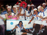 Tem mesmo de tudo nas Cajuranas. Depois do encontrão do Nairê e Chichete é a vez das marinheiras se confrontarem. Mas é tudo na mais perfeita paz. Cad A cajurana Unaldo veio de bóia. Segundo ele é para salvar “as mulheres” em caso de chuva. Tem gente que prefere abusar um pouco mais. Assim, Antonildo, que desfila desde a primeira versão do bloco no Pré-Caju, resolveu se coroar rainha da avenida. Além da produção nas fantasias, muitos resolveram confeccionar seus próprios barcos. Mas o objetivo é um só: se divertir e também levar alegria para quem está assistindo o desfile.