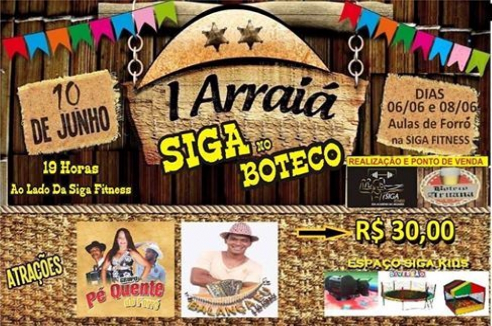 Os trios pé de serra Balança Eu e Pé Quente do Forró vão animar a primeira edição do primeiro Arraiá Siga no Boteco. O evento contecerá no dia 10 de junho, a partir das 19h no residencial Porto Sul, bairro Aruana, ao lado da academia Siga Fitness.