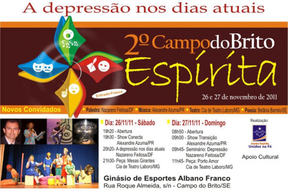 Acontece este final de semana o 2º Campo do Brito Espírita. A realização é do Centro Espírita Unidos da Fé com a finalidade de chamar a atenção da sociedade para os problemas sociais. O tema é deste ano é a depressão nos dias atuais.