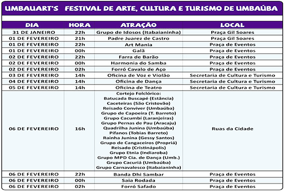 O município de Umbaúba continua em festa. O Festival Umbaubart´s foi criado pela prefeitura de Umbaúba com a finalidade de valorizar as tradições culturais e turísticas do município.