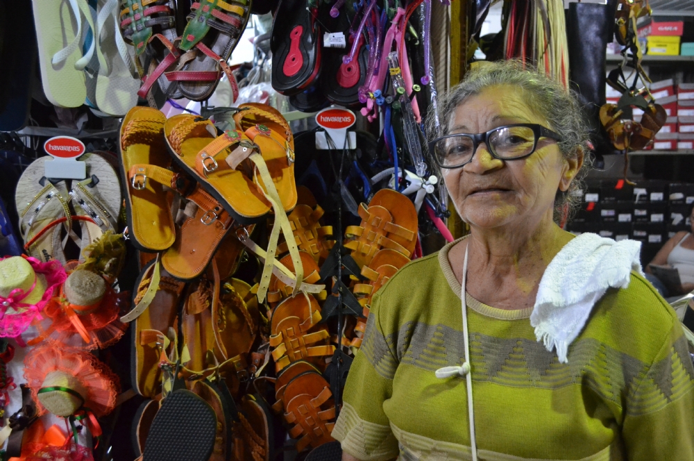 A tradição não é apenas para quem compra – também é para quem vende. Um exemplo é Maria José, de 42 anos, que comercializa o calçado desde os 30 anos. “Minha renda sempre veio daqui”, informa. De acordo com ela, a venda da sandália ocorre durante todo o ano, mas é nessa época que a quantidade triplica. “A gente vende principalmente para os quadrilheiros”, diz Maria. Ano passado, só em sua banca, foram vendidos cerca de 444 pares. Mas é em junho que as vendas decolam e chegam a aumentar 40% em relação aos outros meses.