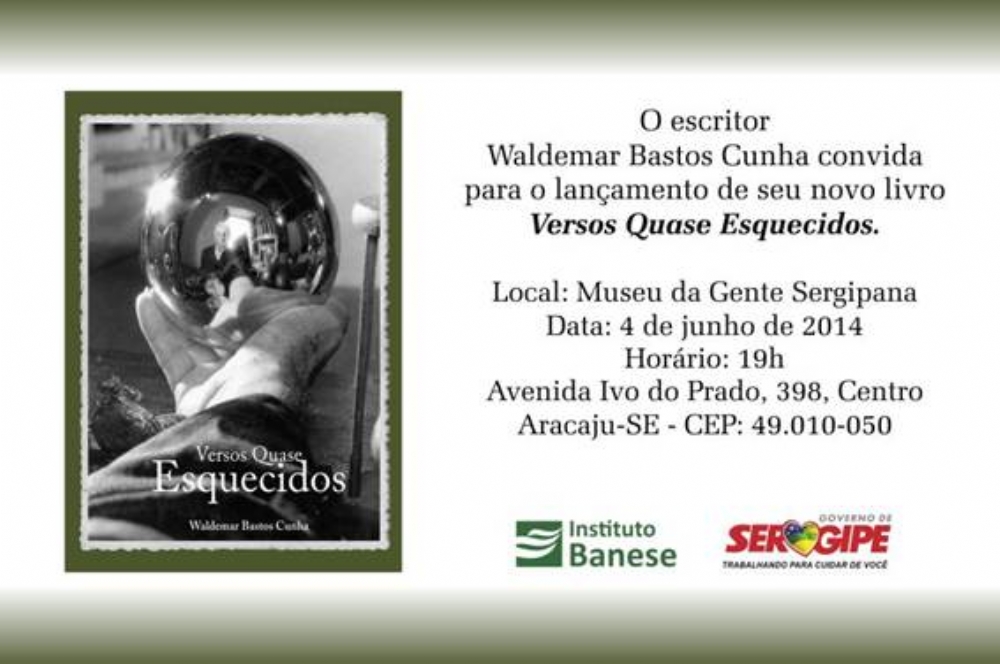 O poeta e advogado Waldemar Bastos Cunha lançará na próxima quarta-feira, dia 04 de junho, às 19h, no Museu da Gente Sergipana, seu livro de poesia denominado “Versos Quase Esquecidos”. O lançamento tem o apoio do Instituto Banese e do Governo do Estado de Sergipe.