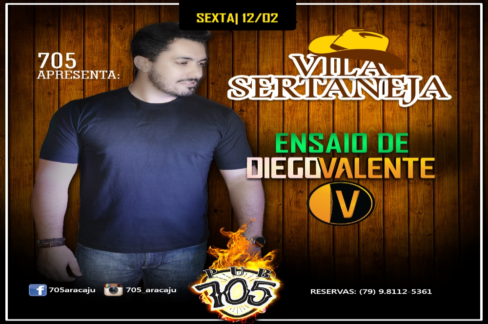 Começa nesta sexta-feira, 12, a Vila Sertaneja do Pub 705. O evento terá como primeira atração o cantor Diego Valente, que promete tocar o melhor do sertanejo. O pub 705 abre às 20h. Será cobrado couvert no valor de R$20, revertido em consumação até as 21h.