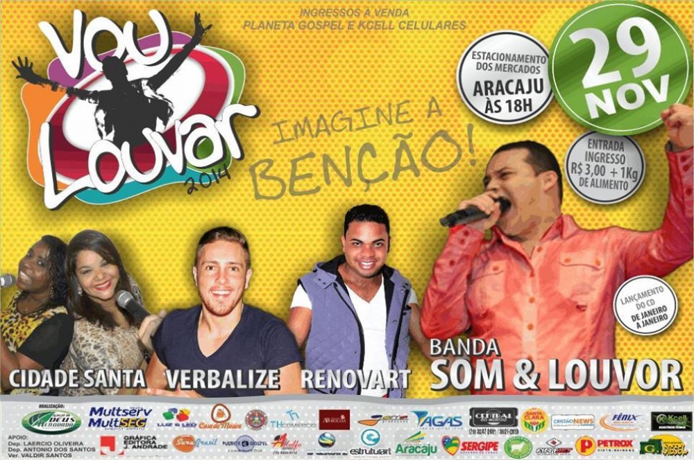 Em sua 9ª edição Vou Louvar Encanta todos os Sergipanos. Vou Lovar 2014 acontece dia 29 de Novembro no estacionamento dos Mercados em Aracaju-SE. Muito louvor, adoração e solidariedade. Estes são os ingredientes do Vou Louvar, um evento totalmente cristão realizado pela Igreja de Deus Renovada que completa a 8ª edição este ano.