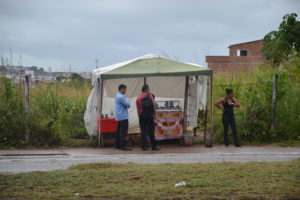 Vendedor de mingaus e café há cinco anos, Carlos Santos Ferreira precisou de uma dinâmica diferente para conseguir vender. “Agora eu fico circulando com meu carrinho por aí. Só paro pra atender os clientes”, disse. No ponto de ônibus e do outro lado da avenida, ambulantes buscavam uma forma de continuar as vendas.