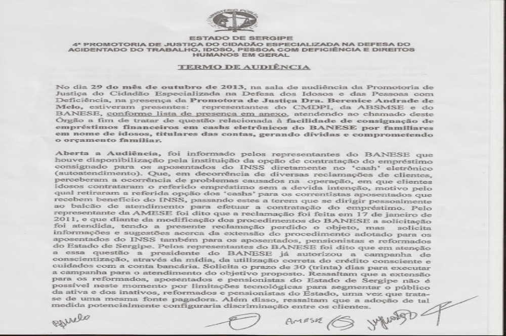 Durante audiência no Ministério Público na última terça-feira, 29, o Banese assinou um Termo de Ajustamento de Conduta (TAC), sobre os empréstimos que são oferecidos pelo banco para aposentados e pensionistas. A solicitação foi provocada pelo presidente da Associação dos Militares do Estado de Sergipe (Amese), sargento Jorge Vieira. De acordo com o presidente da associação vários aposentados e pensionistas estavam enfrentando problemas financeiros por conta dos empréstimos oferecidos pelo banco.