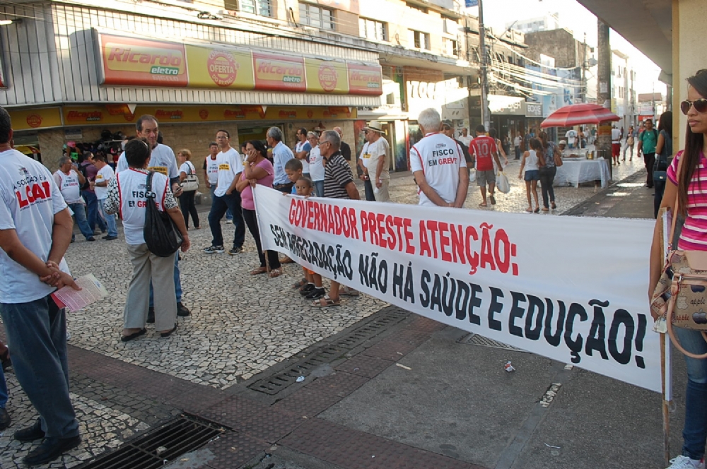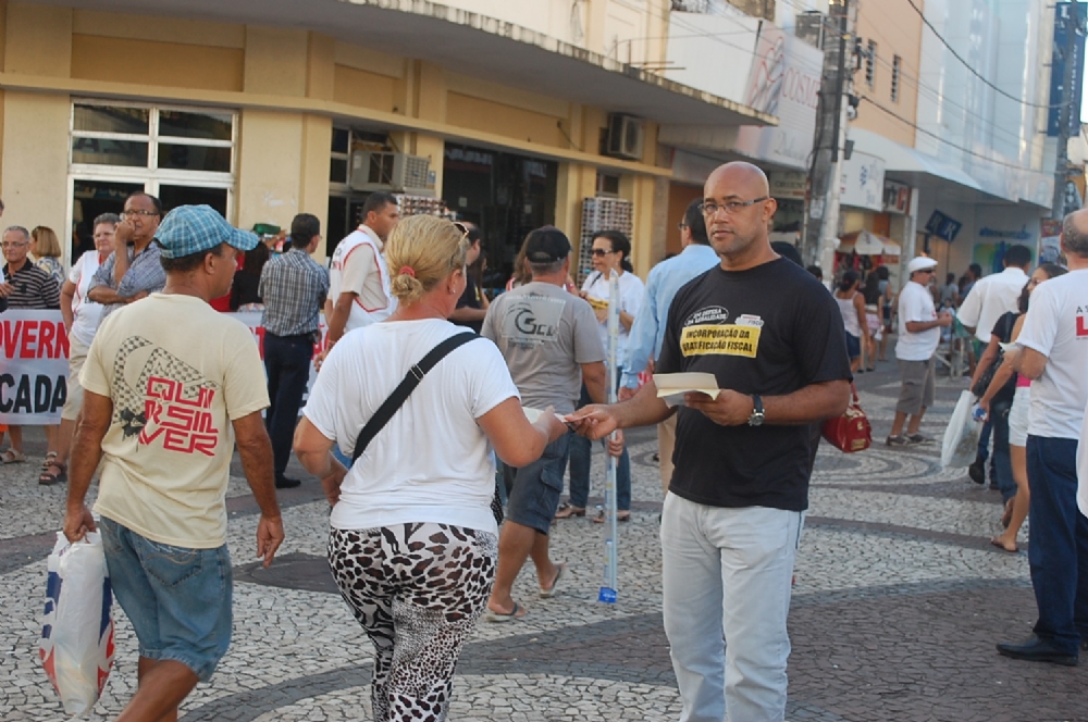 Auditores fiscais de Sergipe realizaram na tarde desta quinta-feira, 8, uma panfletagem no cruzamento dos calçadões das ruas João Pessoa com São Cristóvão. O objetivo foi mostrar a população, a situação pela qual a categoria está passando e que apenas em créditos inscritos na Dívida Ativa [prontos para serem executados judicialmente], o Governo acumula mais de R$ 4 bilhões.