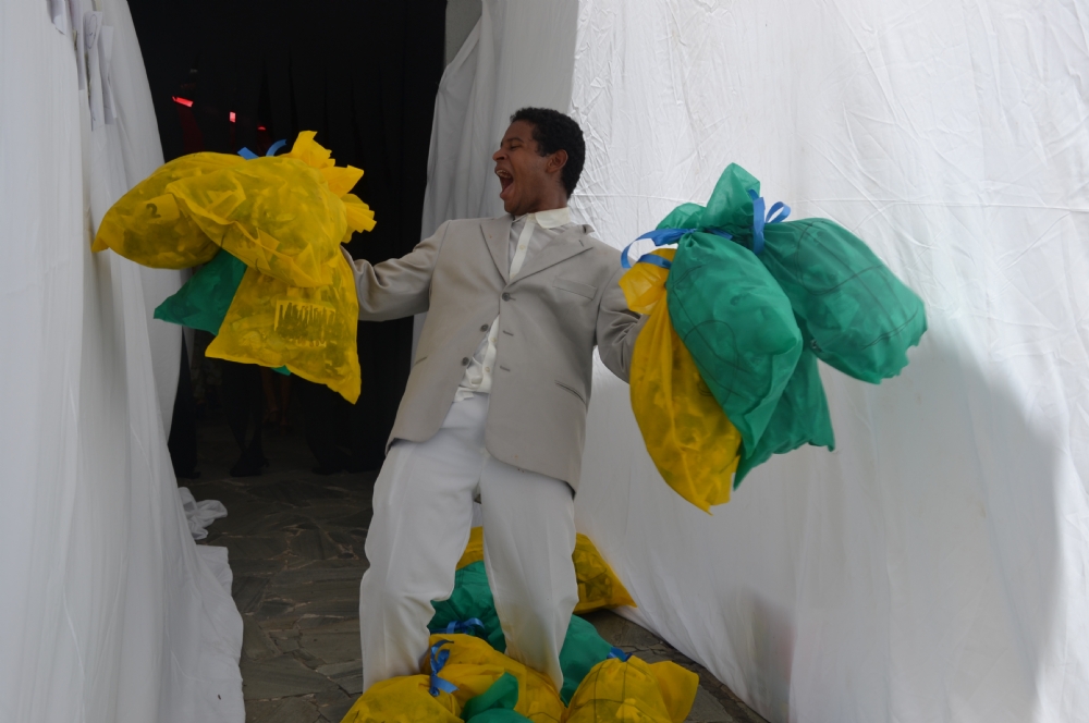 Ao chegar ao local, os bancários passaram por um labirinto, onde foram recebidos pelo personagem do banqueiro, que zombava do escravo bancário; a morte, que representava o corte dos direitos; e um terceiro personagem que era um bancário com o baú de conquistas da categoria, pedindo união e apoio dos colegas. Essa ação, chamada de ‘Labirinto Sensorial’, se trata de uma técnica de teatro performática, que vai além de uma simples encenação, e provoca sensações. “Essa foi a forma que encontramos de receber os participantes e fazer com que eles despertem para o tema e tenham senso crítico”, comentou Ivânia.