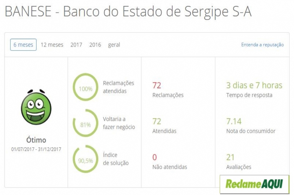 O Banco do Estado de Sergipe (Banese) apresentou nos últimos seis meses um crescimento significativo em sua nota de avaliação no site Reclame Aqui. No período de 1º de julho a 31 de dezembro de 2017, o Banese, numa escala de zero a dez, na avaliação dos clientes no Reclame Aqui, atingiu uma média de 7,14, nota considerada “ótima”, pelo site, e superior às obtidas pelos principais bancos públicos e privados do país.