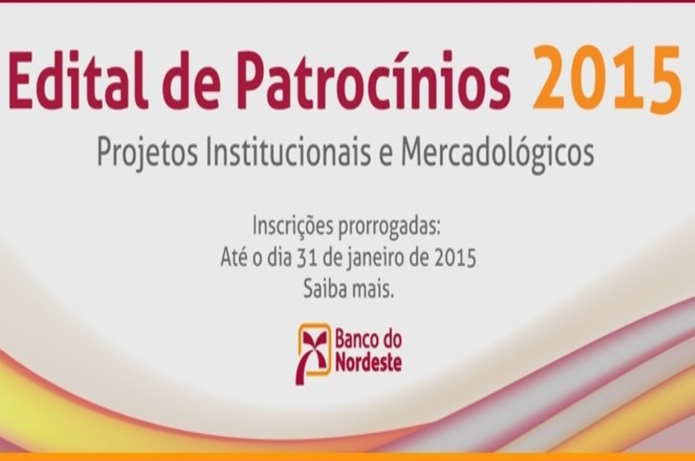 Faltam duas semanas para o encerramento das inscrições do edital de patrocínio do Banco do Nordeste. Os projetos podem ser de cunho institucional ou mercadológico e devem ocorrer no período de abril a dezembro de 2015. Os interessados devem acessar o portal da instituição (www.bnb.gov.br) ou o link http://bit.ly/13derHe até o dia 31/01. O valor máximo de patrocínio por projeto será de até R$ 120 mil.