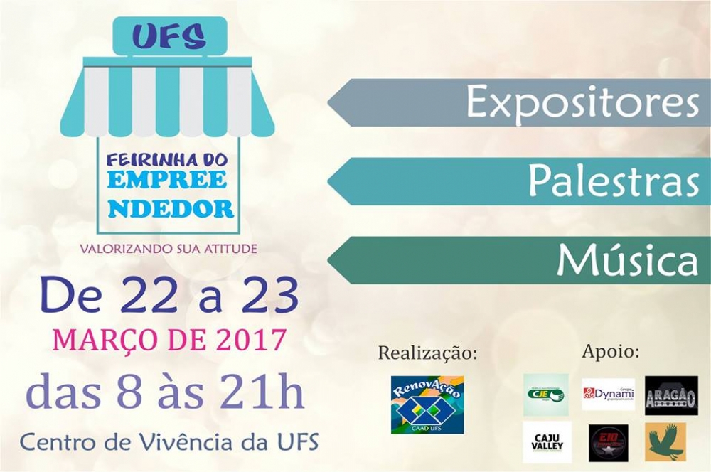Com o objetivo de valorizar o empreendedorismo, o Centro Acadêmico de Administração realizará no dia 22 e 23, das 8h às 21h, a primeira feirinha do empreendedor. Nesses 2 dias os empreendedores terão a oportunidade de expor seus produtos ou serviços para toda comunidade. A Feirinha do Empreendedor também contará com a participação de palestrantes, empresários e uma atração musical no final de casa noite. Venha fazer bons negócios e se divertir.