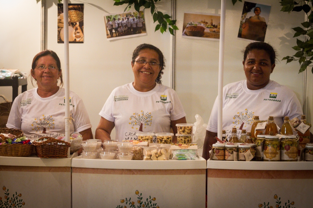 Quem chega no estande das Catadoras é recebido com as delícias da Mangaba, desde as trufas até os licores, passando por balas, bombons, granola, biscoitos, tortelli e o bolo. O sorriso estampado no rosto das Extrativistas reflete histórias de resistência que as mulheres não poupam em contar para quem pára no estande e deseja conhecer a vida das Comunidades Tradicionais de Sergipe.