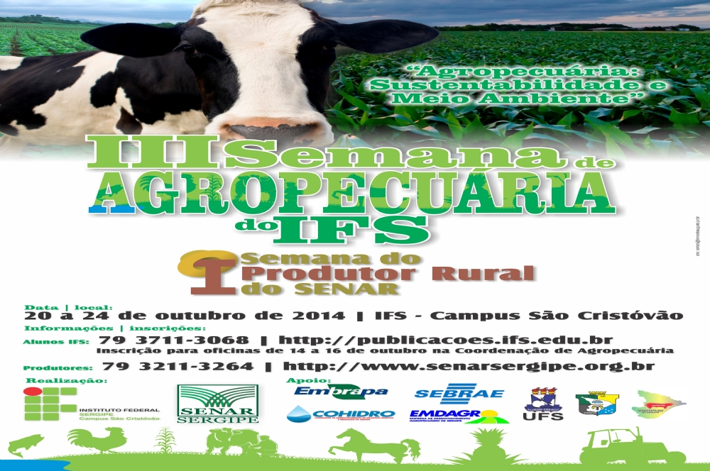 O IFS- Campus São Cristóvão sedia a III Semana de Agropecuária do IFS e a I Semana do Produtor Rural do SENAR. Palestras, cursos e oficinas pretendem, a partir da interação entre diferentes instituições de pesquisa e ensino, ligadas diretamente ao meio rural e a produção agrícola no estado, promover a valorização do profissional de agropecuária e do produtor rural possibilitando maior acesso ao conhecimento técnico profissionalizante.