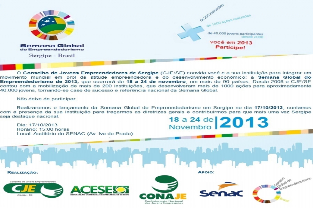 O Conselho de Jovens Empreendedores de Aracaju (CJE/SE) vai realizar o Lançamento da Semana Global do Empreendedorismo que vai acontecer de 18 a 24 de novembro em mais de 50 países, inclusive no Brasil.