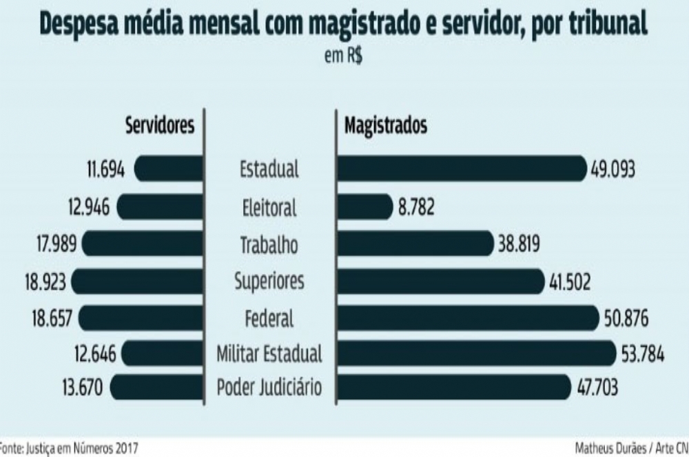 O custo mensal por Magistrado do Poder Judiciário em 2016 foi de R$ 47,703 mil, R$ 13,7 mil por servidor, R$ 4 mil por terceirizado e R$ 871 por estagiário. Os Magistrados custaram na Justiça Estadual R$ 49,093 mil, Justiça do Trabalho R$ 38,819 mil, Justiça Federal, de R$ 50,876 mil, Justiça Militar, de R$ 53,784 mil, Tribunais Superiores, de R$ 41,502 mil e Justiça Eleitoral, de R$ 8,782 mil. O menor custo da justiça eleitoral deve-se ao fato de que os juízes acumulam jurisdição e recebem da justiça eleitoral apenas a gratificação pela atividade. A remuneração efetiva destes magistrados é paga pelo órgão de origem.