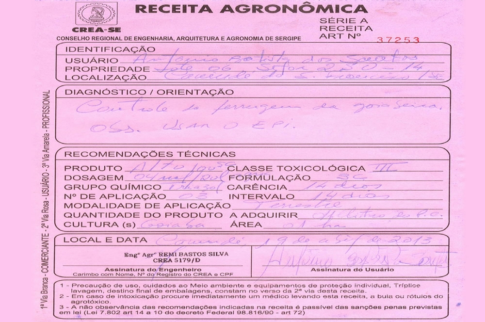 Segundo o engenheiro agrônomo da Cohidro, Arício Resende Silva, a receita agronômica tira todas as dúvidas que o agricultor pode ter no momento da compra e da aplicação. “Vem descrito o nome comercial do produto, para facilitar de ser encontrado no varejo, a quantidade, a forma como deve ser feita a aplicação e a recomendação do uso do EPI no ato da aplicação. Além disso, é descrito o número de aplicações, o período de carência entre a última aplicação do agrotóxico e a colheita da cultura”.
