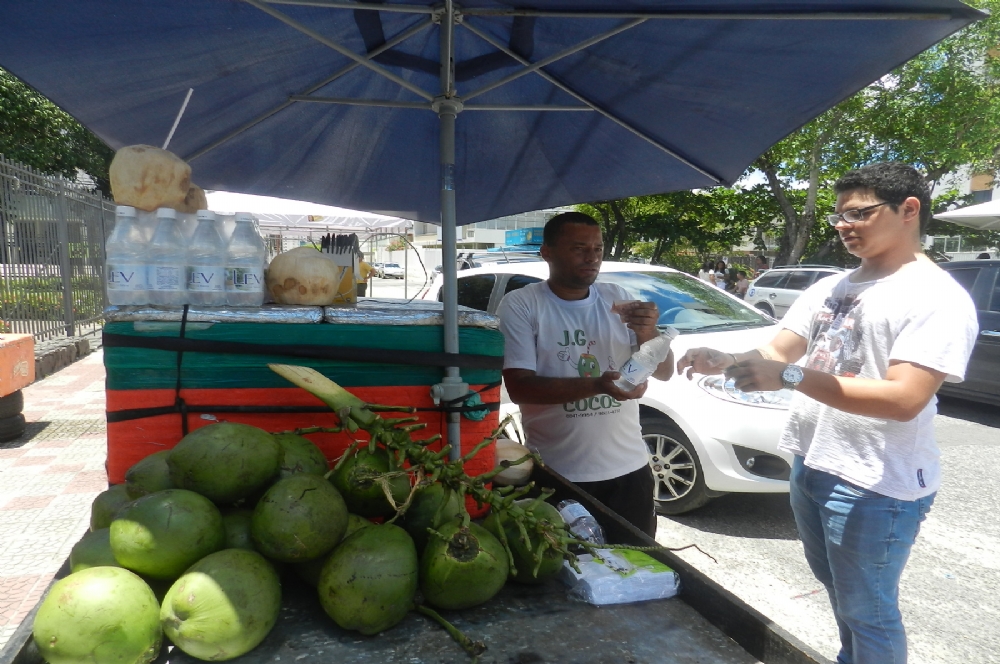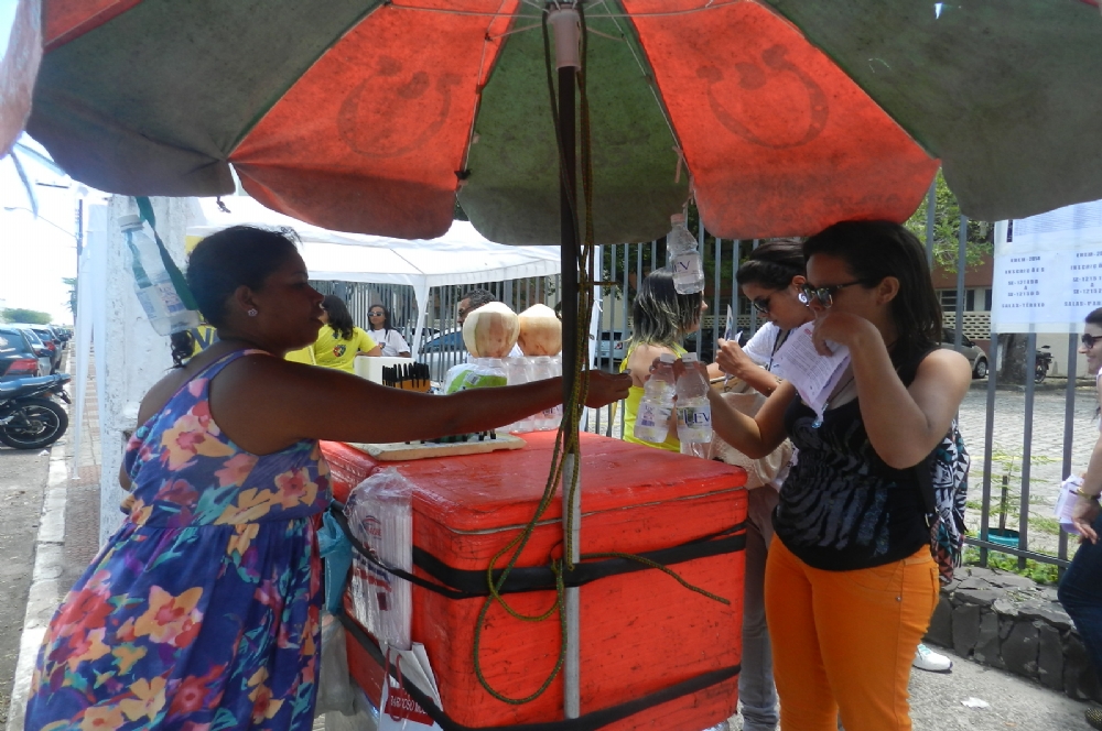 Presente nas portas de escolas durante boa parte dos anos de realização do Enem, o vendedor Jadilson Gomes não perde tempo e tenta comercializar além de água mineral, a de coco, e também as canetas pretas. “É certeza que sempre tem gente que esquece as canetas”, comenta.