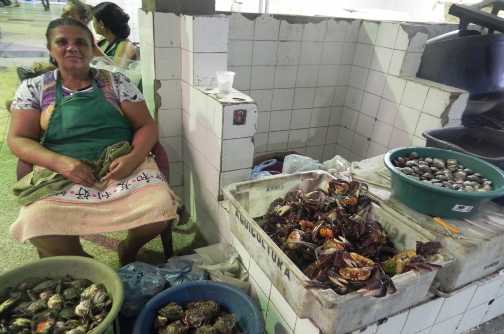 Anunciada é uma das comercializa caranguejos pequenos (R$ 10 a corda) e grandes (R$ 15 a corda), siri (de R$ 10 a R$ 20 a dúzia), lambreta (R$ 4 a dúzia) e ostras (R$ 20 a dúzia). Para o vendedor João Santos, que vende peixes diversos no Mercado Albano Franco há mais de 12 anos, os preços das espécies vermelho, pescada e robalo continuam, praticamente, os mesmos.