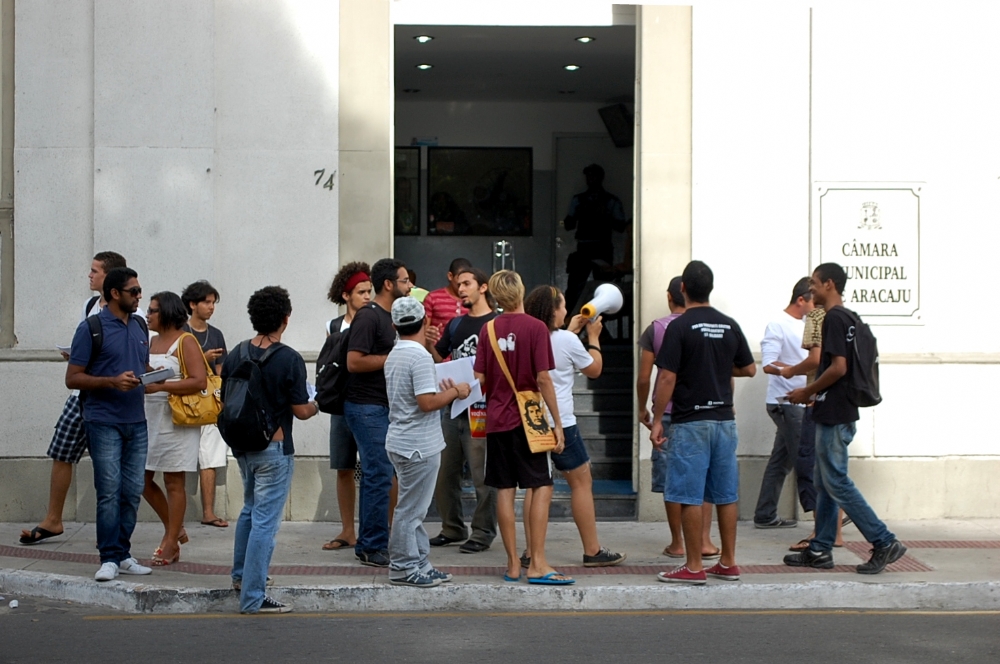 A Frente em Defesa da Mobilidade e Transporte Público promoveu um ato público na tarde desta quinta-feira, 21, em frente à Câmara Municipal de Aracaju (CMA). O objetivo foi tentar pressionar os vereadores para que eles assumam uma posição com relação ao aumento da tarifa e para que eles cumpram o artigo 241 da Lei Orgânica municipal, no sentido de que eles votem a proposta de mudança do valor antes que a prefeitura decrete um aumento.