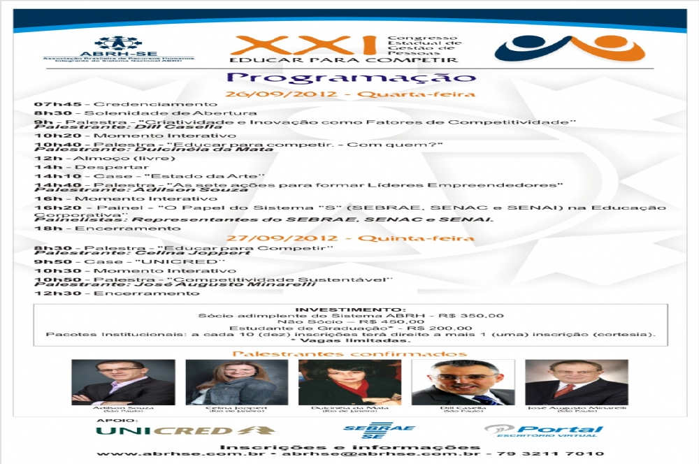 O principal evento para discutir os novos rumos da gestão de pessoas em Sergipe chega à maioridade em 2012. O Congresso Estadual de Gestão de Pessoas de Sergipe, uma realização da Associação Brasileira de Recursos Humanos (ABRH Sergipe), tem sua vigésima-primeira edição nos dias 26 e 27 de setembro.
