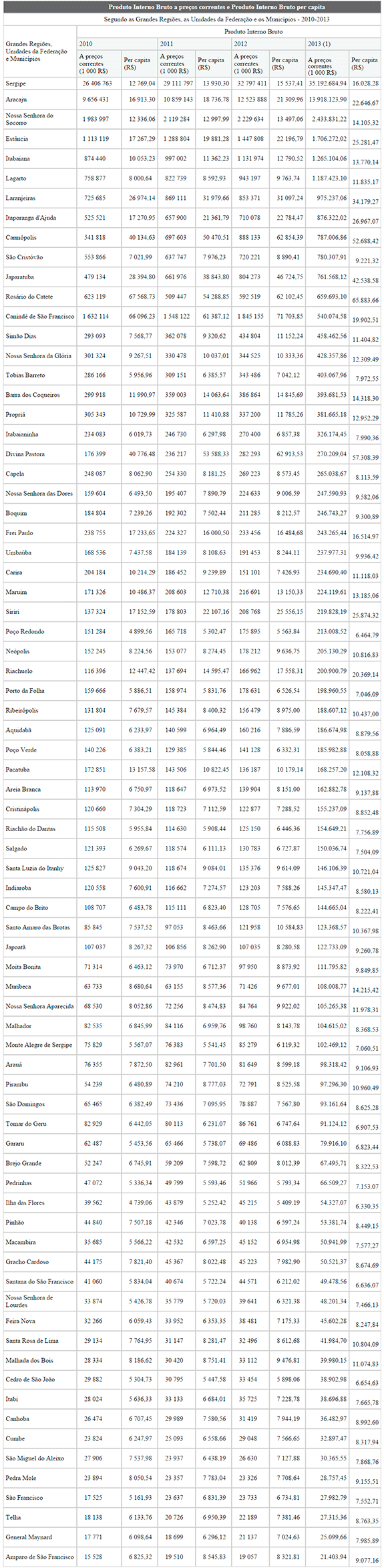 Na tabela adiante temos a discriminação detalhada do Produto Interno Bruto dos municípios sergipanos nos ano de 2010 a 2013.