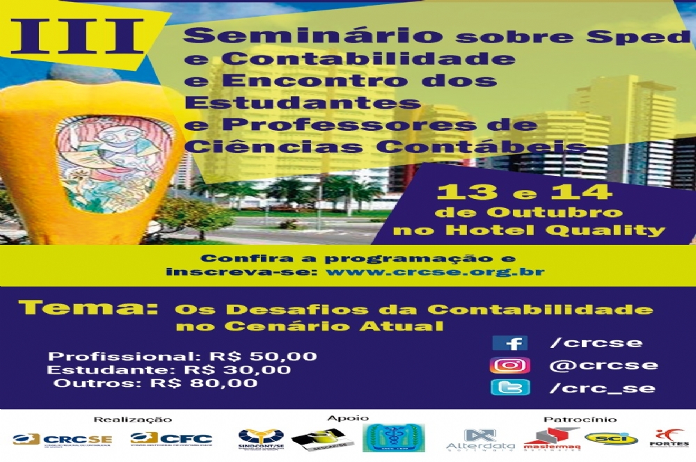 Nos próximos dias 13 e 14 de outubro o Conselho Regional de Contabilidade de Sergipe (CRCSE), realizará a terceira edição do Seminário sobre Sped e Contabilidade e Encontro dos Estudantes e Professores de Ciências Contábeis.