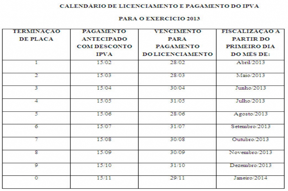 Diferente do que acontecia em outros anos, quando cada final de placa tinha um dia específico para o vencimento, agora cada número final de placa ficará vinculado a um mês. Quem quiser pagar o licenciamento com o desconto de 10% no valor do IPVA deverá efetuar a quitação até o dia 15; já quem pagar depois dessa data, até o final do mês correspondente, perderá a redução no IPVA, mas não pagará multa por atraso no licenciamento.