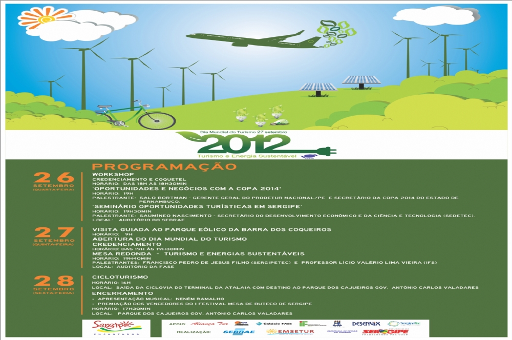 A Secretaria de Estado do Turismo e a Empresa Sergipana do Turismo elaboraram uma programação especial para comemorar o Dia Mundial do Turismo. Com o lançamento mundial da campanha de 2012, foi solicitado pela Organização Mundial do Turismo (OMT), que todos os interventores do turismo façam um esforço para atingir a meta das Nações Unidas de conseguir energia sustentável para todos até 2030, e no intuito de contribuir com essa campanha, a Setur e Emsetur elaboraram uma programação para ajudar na conscientização de todos que envolvem o setor turístico de Sergipe. A celebração acontecerá durante os dias 26, 27 e 28 e traz como tema este ano Turismo e Energia Sustentável.