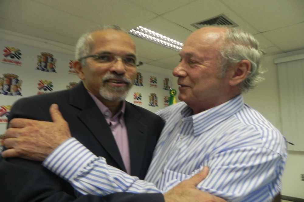 | Edvaldo e Schuster: de mãos dadas contra taxa de estacionamento (Foto: Cássia Santana/Portal Infonet) |
