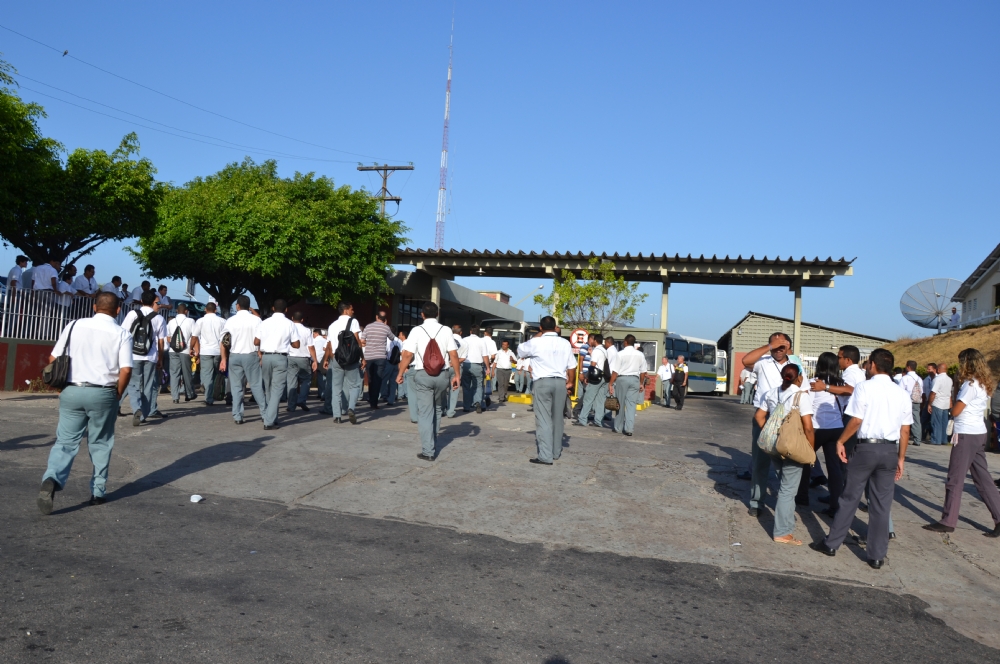 | Trabalhadores se concentram na garagem da empresa durante paralisação |