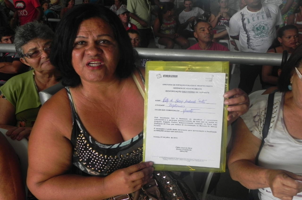 “E eu vendo utilidades como baldes, bacias, panelas há 15 anos aqui na feira do Augusto Franco. Toda feira tem esses produtos. Eu trouxe até os carnês de pagamento, todos em dia. Não entendo porque não podemos ficar”, completa Joana dos Santos.