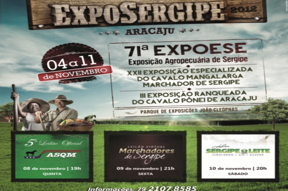 Já estão abertas e seguem até o dia 26 (sexta-feira), as inscrições para animais que participarão da Exposergipe Aracaju. Os criadores interessados em inscrever seus animais para o evento que tem data marcada para acontecer de 4 a 11 de novembro no Parque de Exposição João Cleóphas, devem ficar atentos aos prazos. A exposição será dividida em duas etapas para os Equídeos: Trote – Quarto de milha, Paint Horse, Apaloosa, P.S.I e Marcha – Campolina, pampa e outras raças – acontecem de 4 a 6 de novembro (de domingo a terça-feira) e Marcha – Mangalarga, mangalarga marchador, pônei e piquira – de 8 a 11 (de quinta a domingo).