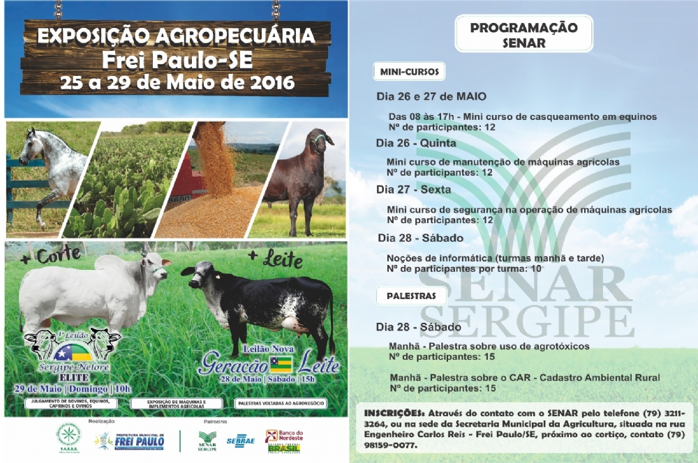 Até o dia 29 de maio o evento reunirá em um só lugar, o que há de melhor na agropecuária sergipana. Serão expostos ao público 390 animais de alta qualidade genética. Desse total 40 são equinos, 250 bovinos, e 100 entre ovinos e caprinos. Além disso, o Sistema FAESE/SENAR Sergipe estará oferecendo entre os dias 26 e 28 quatro mini-cursos: casqueamento de equinos, manutenção de máquinas agrícolas, segurança na operação de máquinas agrícolas, noções de informática – ofertado para alunos das redes municipal e estadual de ensino, acima de 14 anos. Além de duas palestras: uso de agrotóxico e Cadastro Ambiental Rural. As inscrições estão sendo realizadas na sede da Secretaria Municipal da Agricultura, localizada na rua Engenheiro Carlos Reis, próximo ao Cortiço.
