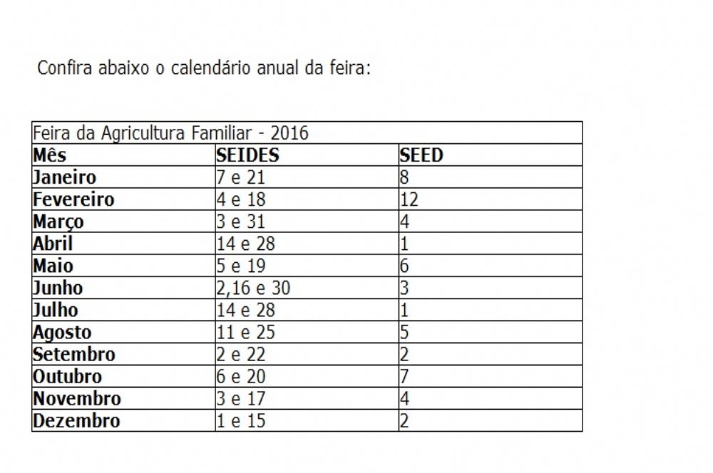 Durante todo o ano, sempre nas primeiras semanas do mês, a feira de produtos sem agrotóxicos aporta no estacionamento de entrada do Complexo Administrativo e Pedagógico da Seed, motivando a venda de produtos sem agrotóxicos, sem atravessador e disponibilizando o escoamento da produção familiar.