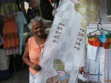 Já a vendedora Maria São Pedro não se cansa de oferecer seus produtos aos sergipanos e turistas. Com simpatia, ela consegue convencer os freqüentadores da feira, de que seus produtos são originais e possuem preços convidativos. Ela conta que fazer bordados em ponto de cruz é uma distração. “Os turistas estão visitando muito a nossa feirinha. Minha barraca é variada. Eu faço muitas lembrancinhas, que custam entre R$ 5, os paninhos de bandeja, até R$ 50, as toalhas de mesa bordadas”, destaca mostrando o seu carro-chefe, uma passadeira com a figura do papa. Maria São Pedro mostra sua srte em ponto de cruz