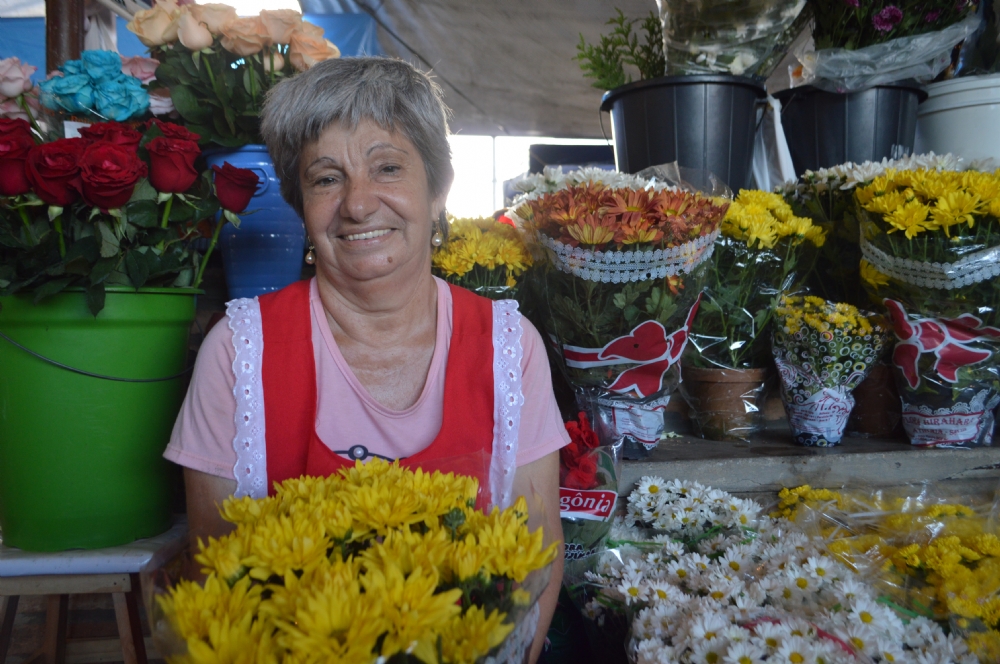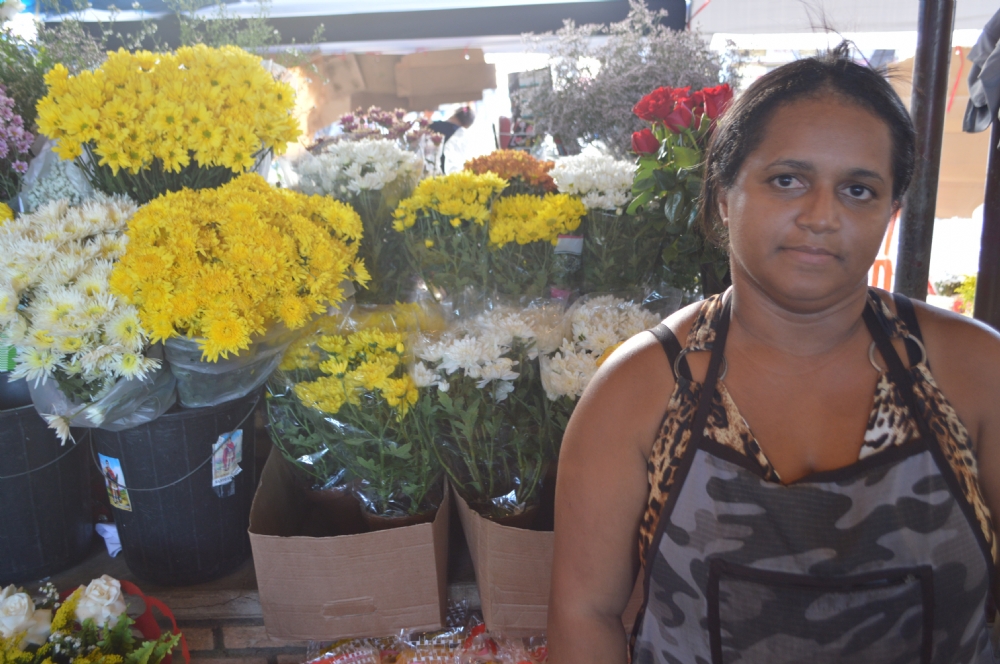 De vários tipos, cores, tamanhos e valores, as flores são as responsáveis pelo sustento de Maria Janete Gonçalves, 64, há mais de 18 anos. Segundo ela, as vendas este ano caíram em cerca de 40%, quando comparado ao ano anterior. “É como se fosse uma chuva fina que vai pingando bem lentamente, mas dá para tirar alguma coisa”, compara.