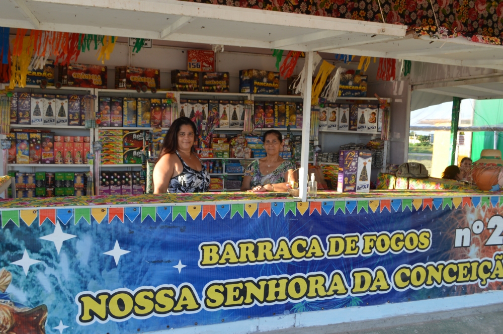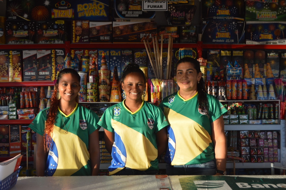 Os comerciantes que vendem fogos de artifício na Feira de Fogos do bairro Coroa do Meio resolveram este ano apostar nas decorações que remetem à Copa do Mundo para tentar alavancar as vendas neste ano. Com barracas decoradas e até vestimentas personalizadas eles acreditam que uma boa campanha da Seleção Brasileira alavancaria as vendas.